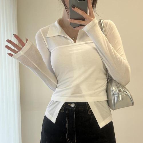 [옷자락] 여자 레이어드 셔링탑 슬림 카라넥 긴팔티셔츠 세트