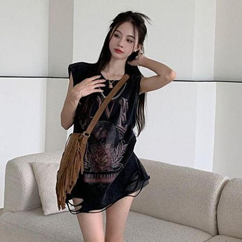 [에이치플러스몰]다크헬업나시티 체인 민소매 오버핏 데미지 빈티지 레이어드 나시 무지 티