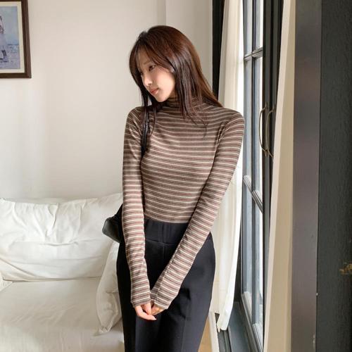 [옷자락]여자 캐주얼 레이온 스판 배색 단가라 폴라넥 티셔츠