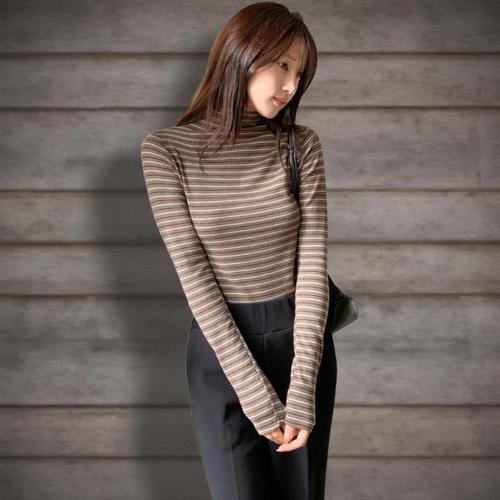 [옷자락] 여자 캐주얼 레이온 스판 배색 단가라 폴라넥 티셔츠