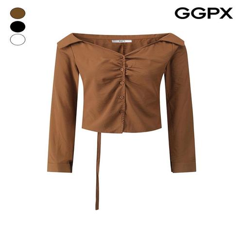 [GGPX]오픈 카라 버튼 셔링 백 벨트 블라우스 (GQ1SH008F)
