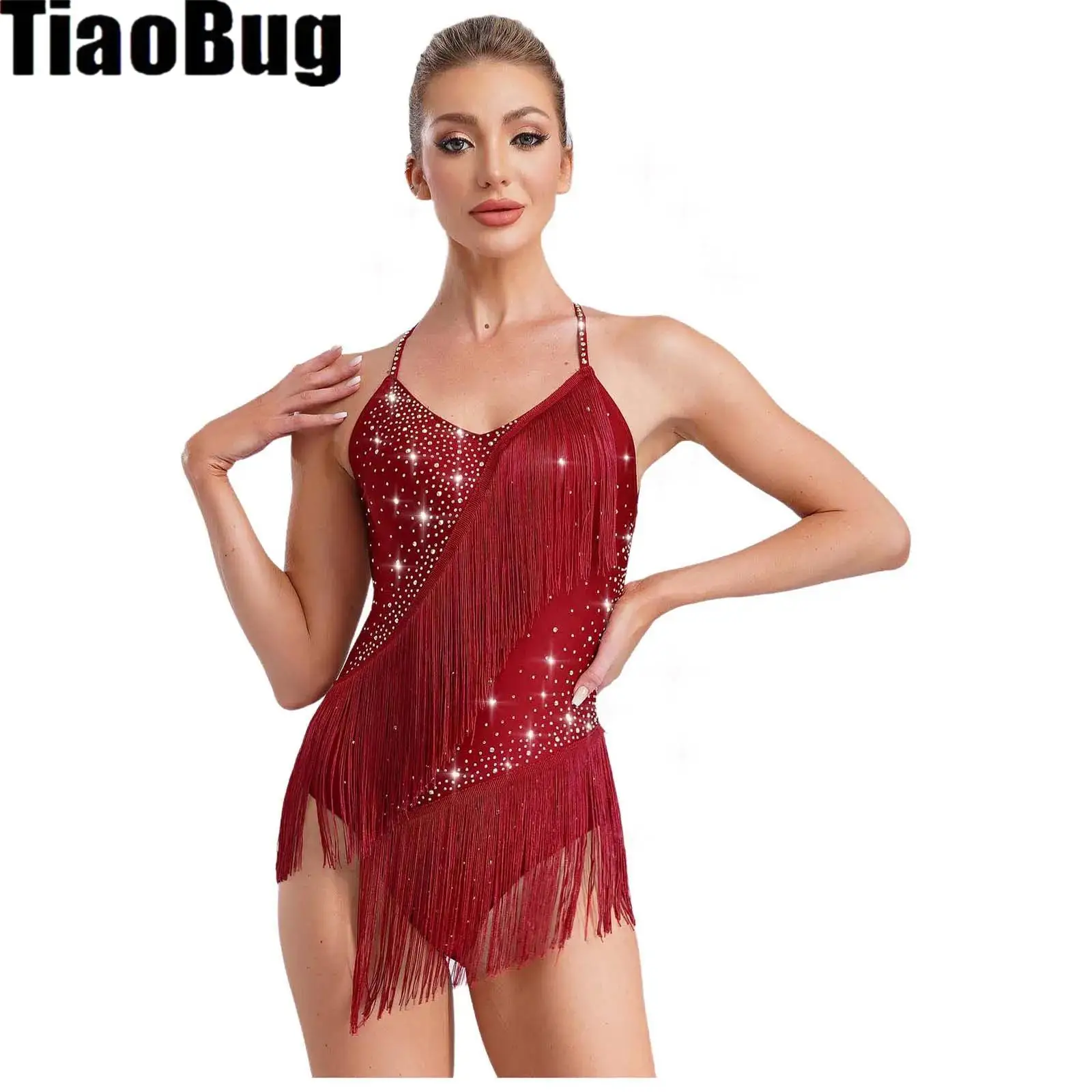 여성 라틴 댄스 레오타드 민소매 홀터넥 넥 라인 석 장식 된 등받이 술 레오타드 공연 경쟁