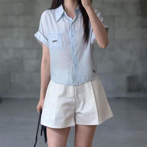 [옷자락]여성 파스텔 크롭 롤업 반팔 시스루 카라넥 셔츠
