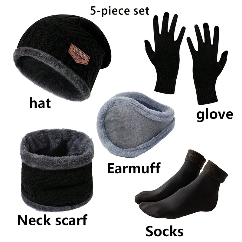 겨울용 따뜻한 모자 세트 남성용 귀 보호대 니트 모자 장갑 목 후드 미끄럼 방지 양말 5종 세트