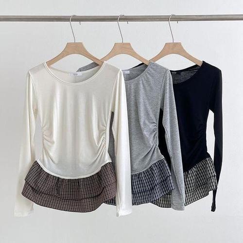 [다잇템_패션]여성 격자 프릴 롱슬리브 타이셔츠