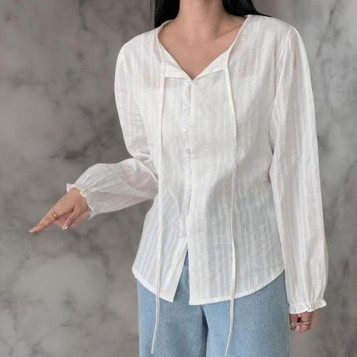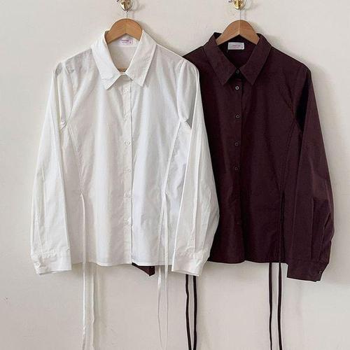 [다잇템_패션]여성 단추 코튼 뒷리본 단가라 롱타이 셔츠
