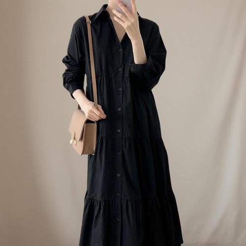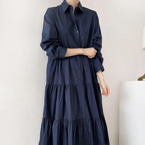 [신상오픈런]여성용 가을 박시 셔츠 포켓 셔링 롱드레스