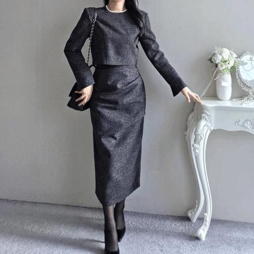 [엘린무드](세트) 아라 헤링본 숏 지퍼 탑 언발 셔링 드레이프 롱 스커트 겨울 투피스(2COLOR)