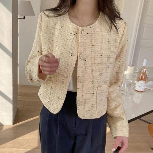 [다잇템_패션]여성 격자 트위드 카라없는 롱슬리브 자켓