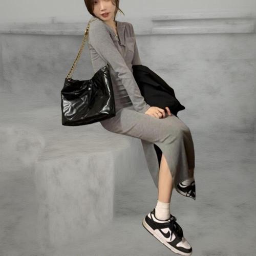 [옷자락]여성 슬림핏 사이드 트임 포켓 후드 긴팔 롱 드레스