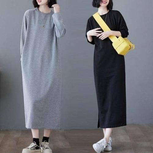 페이준 여성 추동 기모 도톰 빅사이즈 오버핏 원피스 캐주얼 오버핏 트임 솔리드 맨투맨 롱원피스 YF1159
