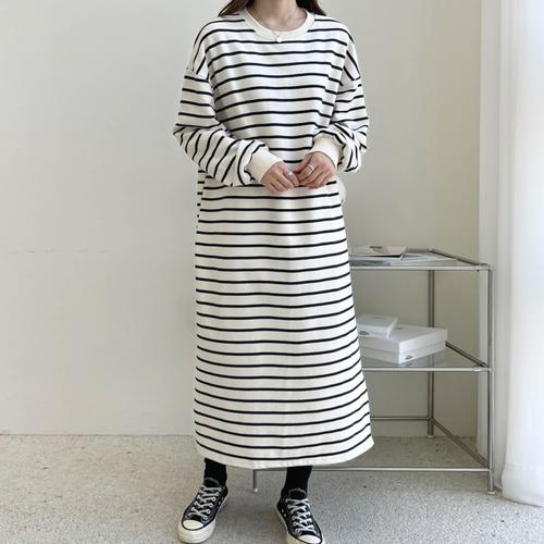 [문에이블]문에이블 여자 여성 봄 가을 루즈핏 스트라이프 단가라 빅사이즈 데일리 긴팔 맨투맨 롱 원피스