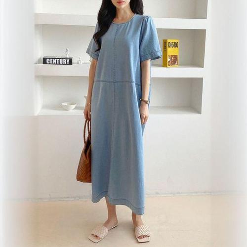 [에이치플러스몰]리사 데님 루즈핏 반팔 롱원피스