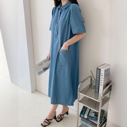 [에이치플러스몰]바이 루즈핏 데님 롱 반팔 원피스
