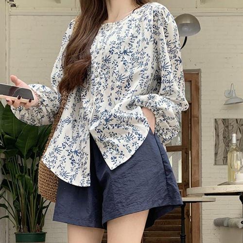 오버핏 긴팔 플라워 블라우스 숏팬츠 반바지 세트 WFLX6HA
