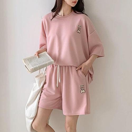 besteffie 여성 캐주얼 세트 반팔 티셔츠 반바지 봄 여름 패션 루즈핏 면 소재 얇은 K95