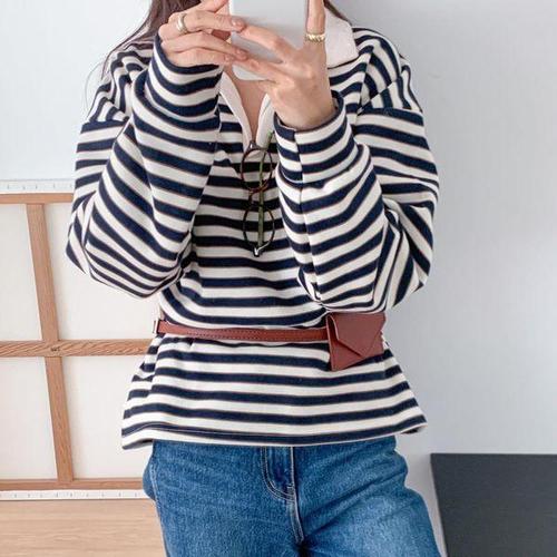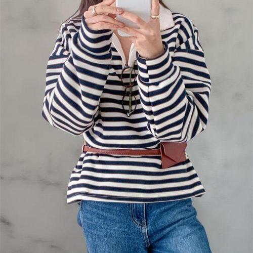 [옷자락]여성 스트라이프 배색 오픈카라 기모 루즈핏 티셔츠