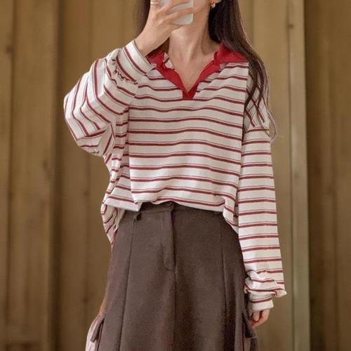 [신상오픈런]|KST9721|여성 오픈카라 스트라이프 배색 루즈핏 티셔츠_22553941_597559