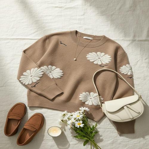 [미라클세븐]여성용 사랑스러운 플로럴 라운드넥 루즈핏 긴팔 스웨터
