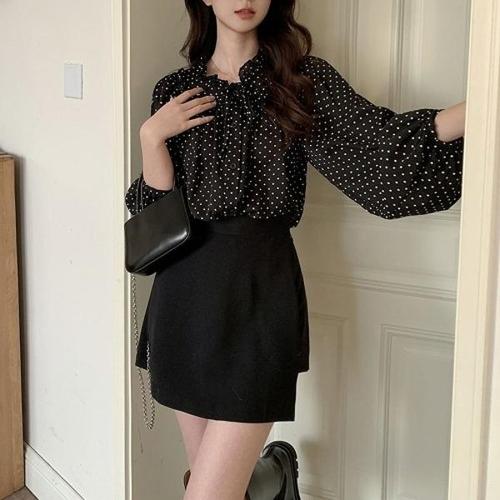 [엄지척]여성 도트 프릴한 리본넥 찰랑 블라우스 블랙_19659238_667501