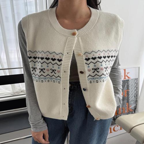[옷자락]여성 러블리 하트 리본 패턴 박시 니트 조끼