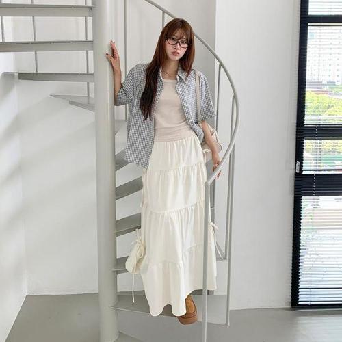 [다잇템]여자 고무줄 스트랩 티어드 롱 리본 스커트