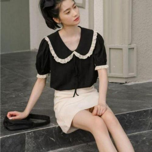 [옷자락] 여자 배색 레이스 리본 핀턱 페플럼 크롭 블라우스
