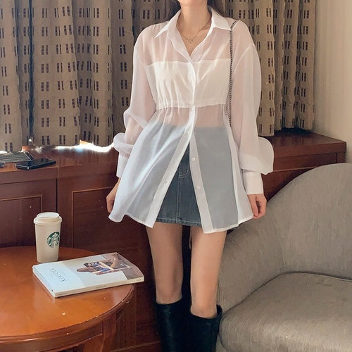 [에이치플러스몰]긴팔 무지 시스루 플레인트임셔츠 찰랑 여름 리본