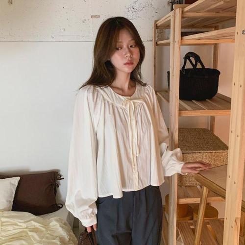 [하젤]누키오 허리리본 핀턱 면셔츠_F4280
