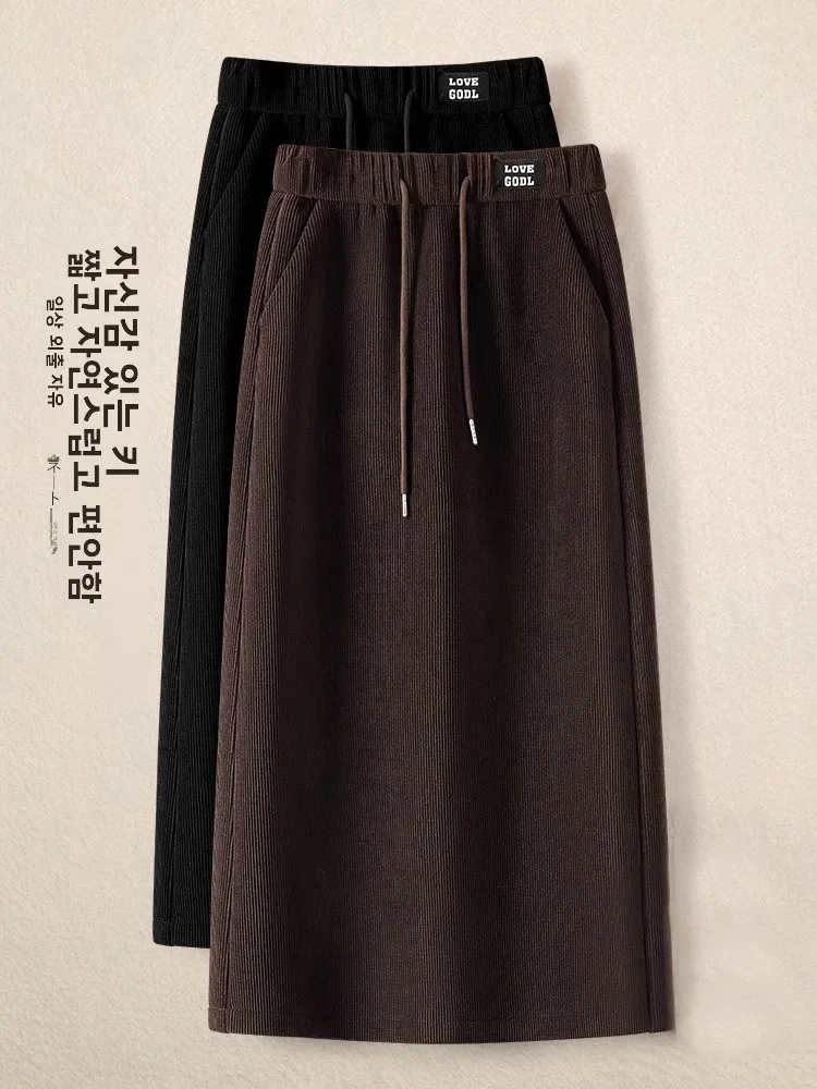 레트로 코듀로이 미디 스커트 여성용 2025 신상 가을 겨울 하이웨이스트 슬리밍 스몰 사이즈 스트레이트 레그 원스텝 스커트