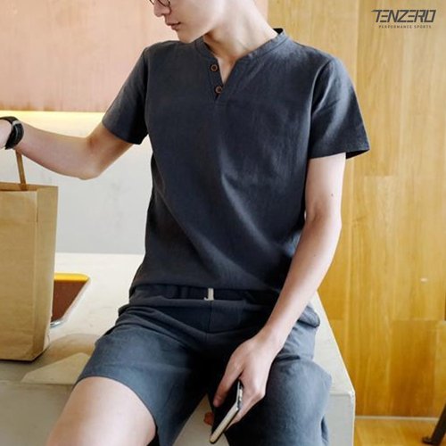 텐제로 면마 린넨 얇은 통풍 투버튼 브이넥 반팔 세트 TEN23-5SET11