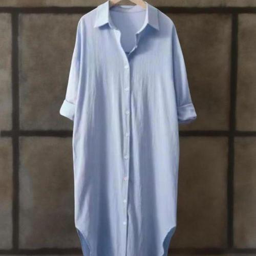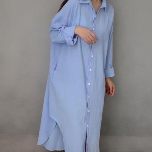[옷자락]여성 부드러운 린넨 카라넥 루즈핏 긴 원피스 셔츠