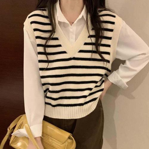 [엄지척]여성 단가라 니트 브이넥 캐주얼 린넨셔츠_19557050_667501