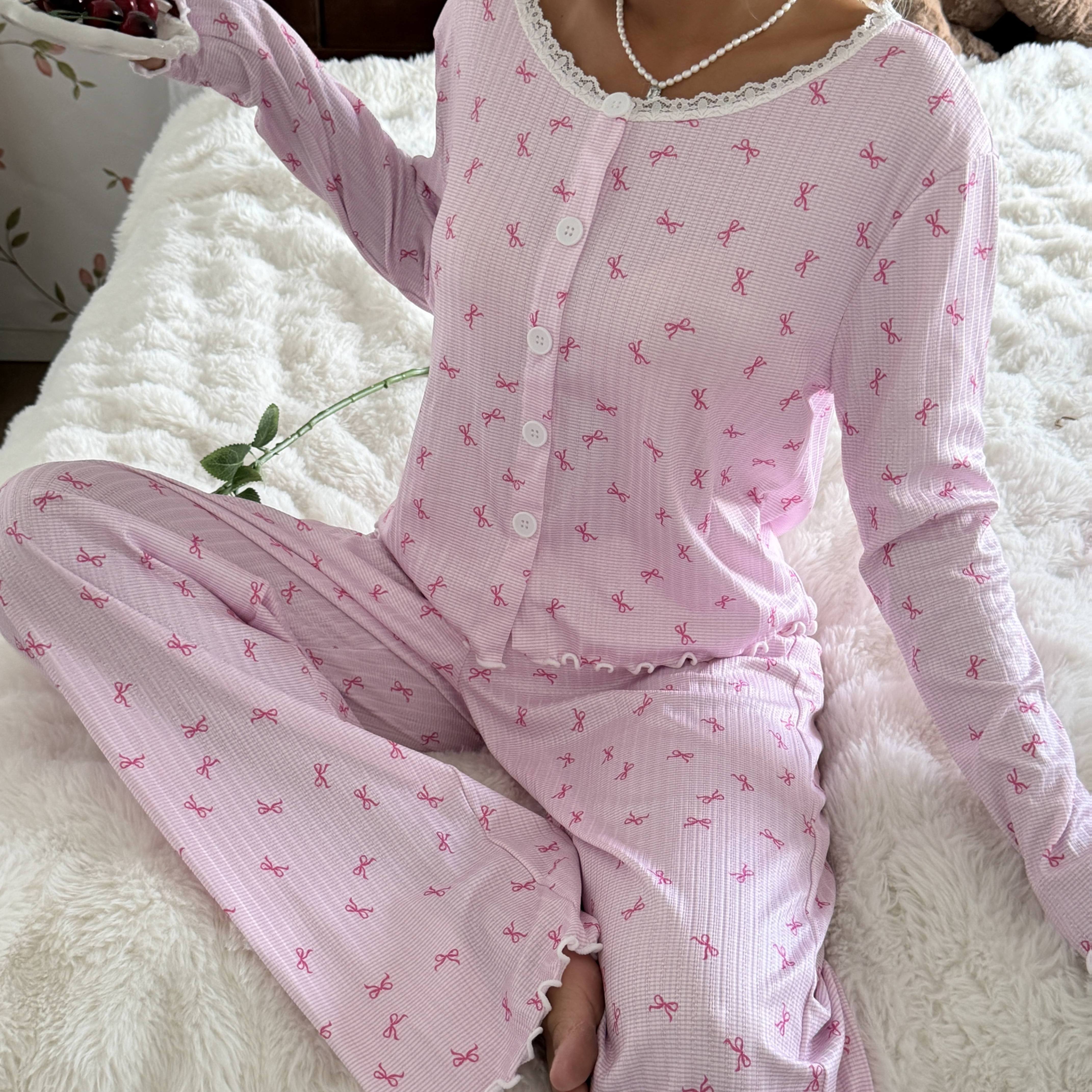 TEMU 가을 겨울 긴팔 긴바지 리본 프린트 파자마