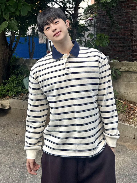 [마인드브릿지 맨] 카라 배색 오버핏 스트라이프 티셔츠