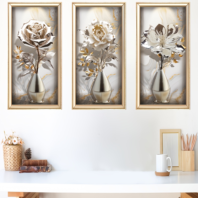 TEMU 3pcs 3D 바구니 벽 스티커 - 화이트, 골드 및 블랙으로 꽃 디자인을 갖춘 우아한 자체 접착식 제거 가능한 PVC 데칼, 거실, 침실, 출입구 장식, 장식 스티커|우아한 장식 조각|가리키는 마감