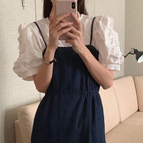 [에이치플러스몰]멜빵 원피스 데님 레이어드 원피스