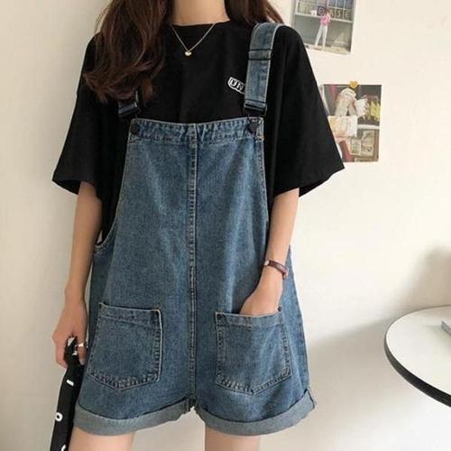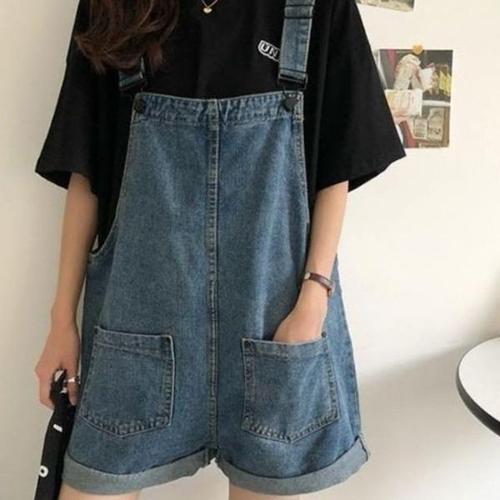 [옷자락]10대 여성 여유핏 데님 멜빵 반바지