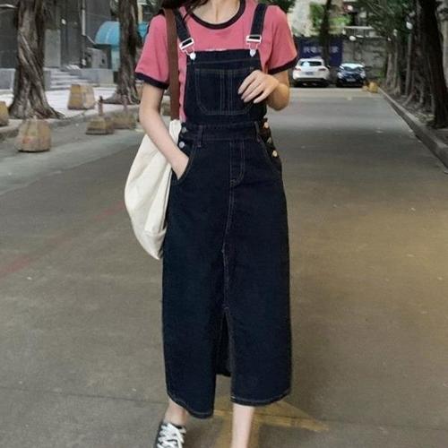 [엄지척]데님 멜빵원피스 롱기장 H라인 앞트임 끈조절_19914548_667501
