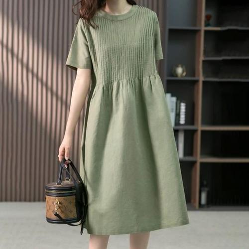 중년 여성 면 마 원피스 라운드넥 반팔 여름 캐주얼 원피스 빅사이즈 엄마옷