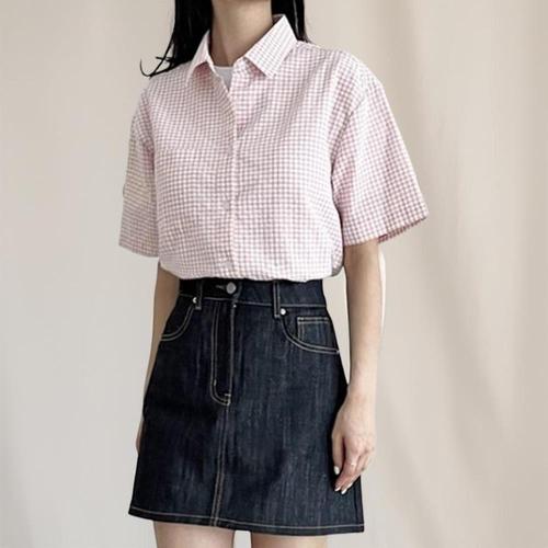 [신상오픈런]여성 쿨링 체크 시어서커 반팔 블라우스 면혼합