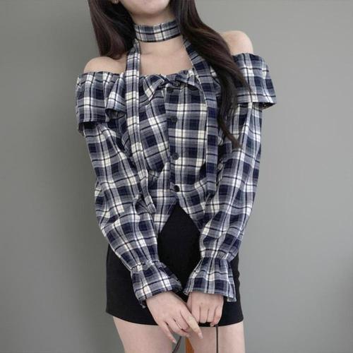 [옷자락]여자 코튼 배색 체크 초커넥 셔링 프릴 블라우스