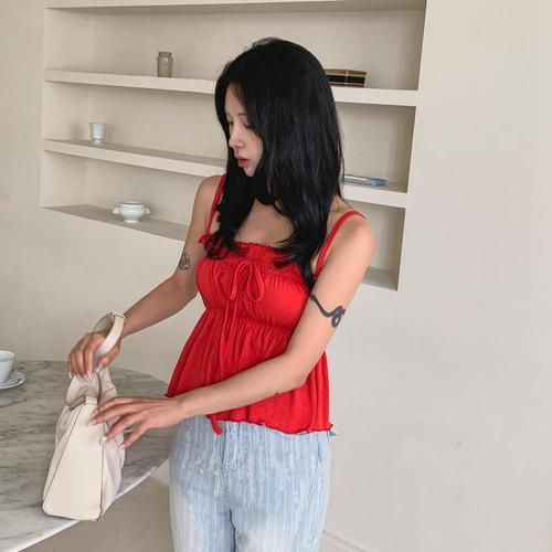 [신상오픈런]여성 면혼합 리본 스트랩 셔링 나시 블라우스