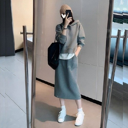 TEMU 우아한 여성용 단색 후드티 & 드레스 세트 - 폴리에스테르, 세탁기 사용 가능, 봄/가을 패션