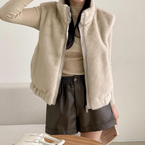 여성 겨울 부드러운 인조퍼 밴딩 하이넥 집업 조끼