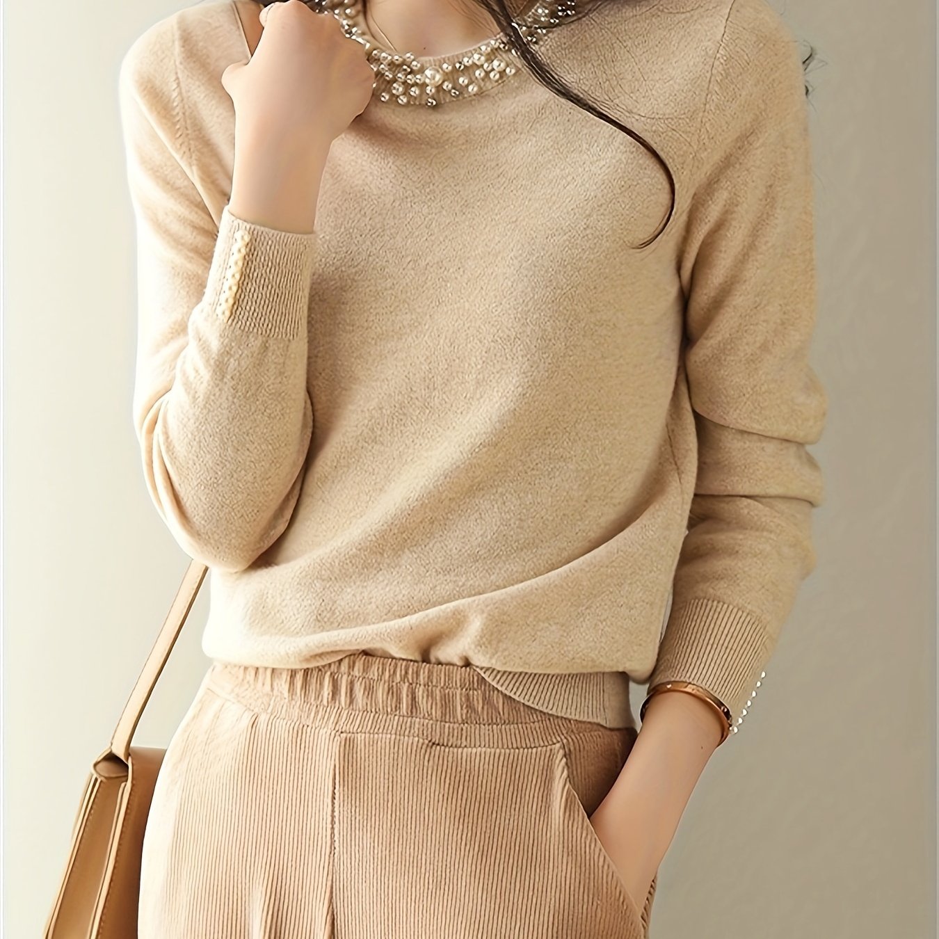 TEMU 여성 캐주얼 크루넥 롱슬리브 니트 스웨터, 진주 장식, 일반 핏 단색 풀오버 상의, 폴리에스터 25% 비스코스 75%, 중간 신축성, 모든 계절 - 350g/m²