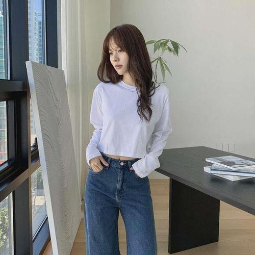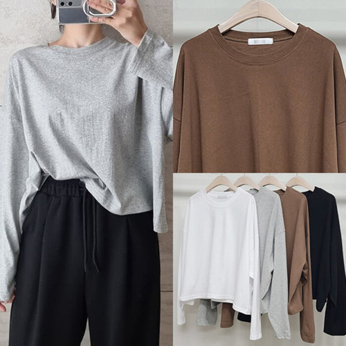[옷자락] 여성 무지 크롭 긴팔면 티셔츠