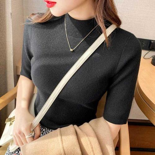 [에이치플러스몰]골지 니트 티셔츠 반목 슬림핏 5부소매 무지 출퇴근룩