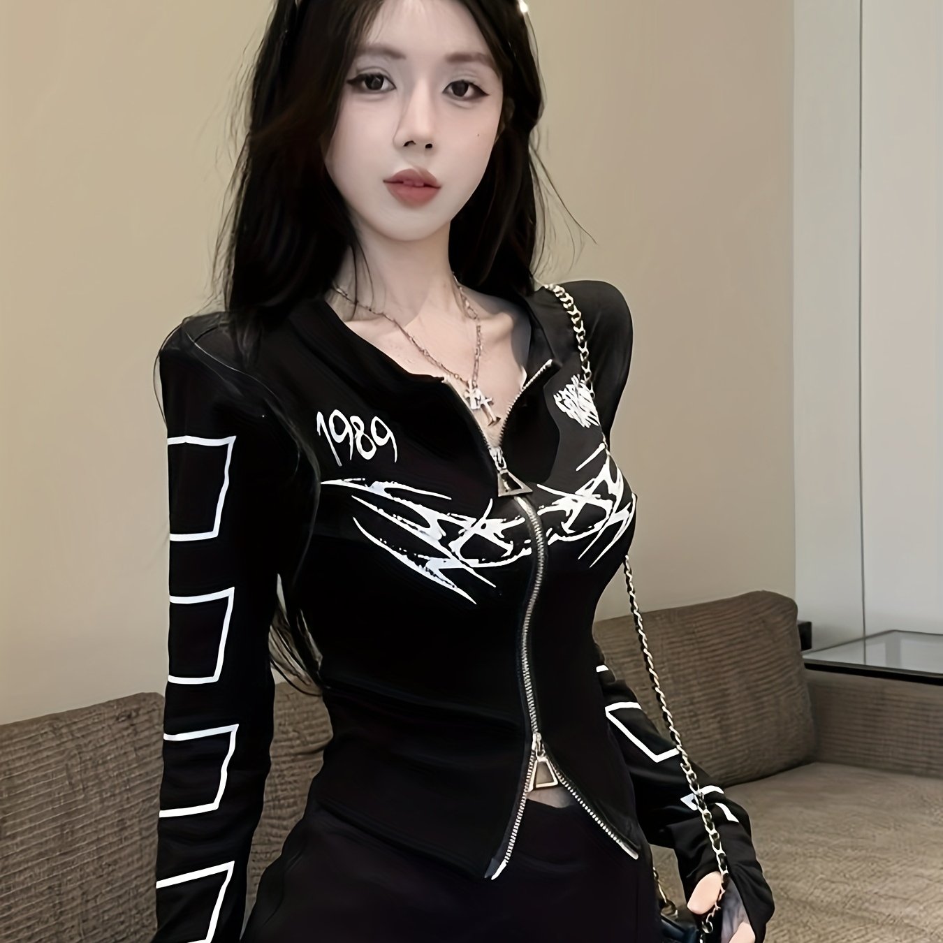 TEMU 여성을 위한 스탠드 칼라와 더블 지퍼 프린트 디자인의 스트리트 스타일의 매운 긴팔 가디건. 가을에 완벽한 이 패셔너블한 숏 재킷은 튼튼하고 편안한 원단을 사용하며, 테일러드 핏을 특징으로 합니다.