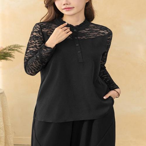 ROYALBELLE 여성 빅사이즈 스탠드넥 긴팔 셔츠 문예 루즈핏 버튼 블라우스 F0031318
